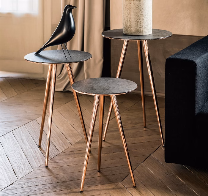 Trip coffee table with three leg frame in metal. Available in three different sizes.