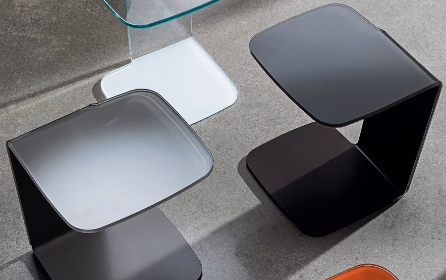 Bent glass coffee table lacquered mono or two-tones or in extralight glass with lacquered bottom part.