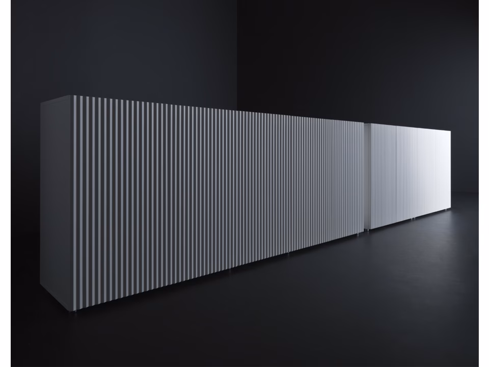 From the front, the doors appear marked by vertical multi-coloured stripes yet, when observed from the side, dark or light uniformity prevails.