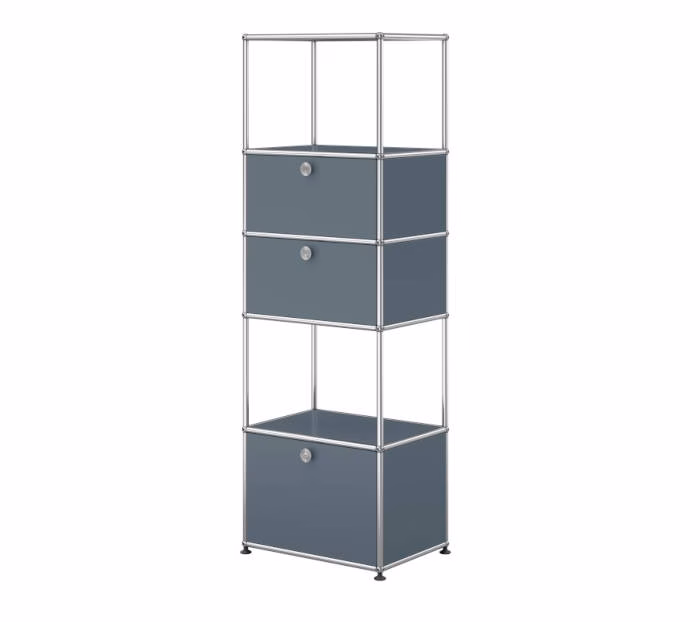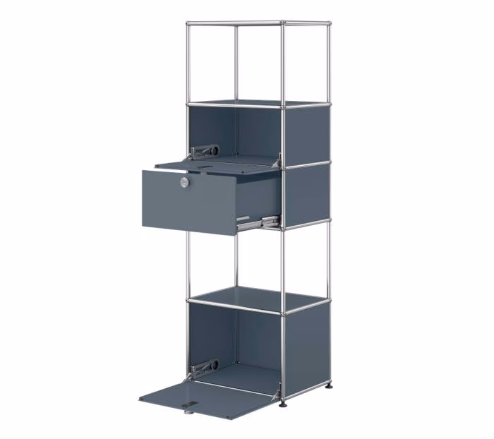 Small and compact, yet truly spacious. This shelf is an ideal fit for any home. It offers plenty of storage space for your belongings and features two drop-down door. USM Haller shelf with two drop-down doors and one extension door with metal box insert. Arrives fully assembled
