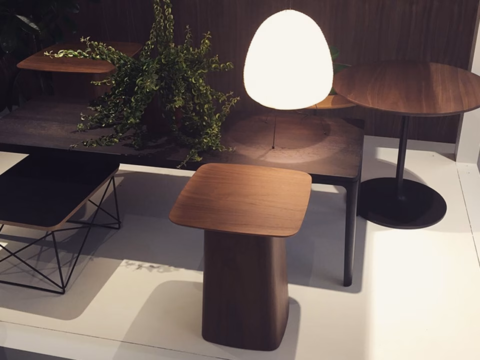 The slender tops of the Wooden Side Tables by Ronan and Erwan Bouroullec have a lightly curved lip, lending them an elegant, almost Japanese look. The lightweight occasional tables come in three sizes, with a natural oak, dark oak or walnut veneer.