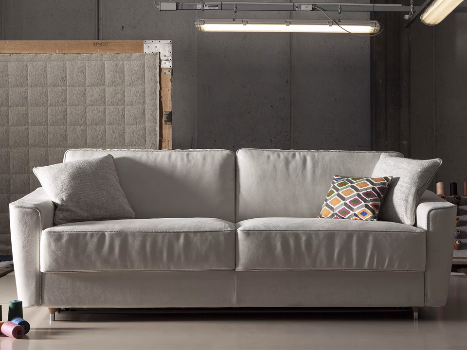 Petrucciani fits with style to all environments. By simply rotating the back, without removing any of the cushions, Petrucciani converts into a conventional bed with a 195 cm. mattress. The cover is completely removable and washable according to the fabric chosen. Petrucciani is also available as a sofa and can be completely disassembled for easy delivery.
