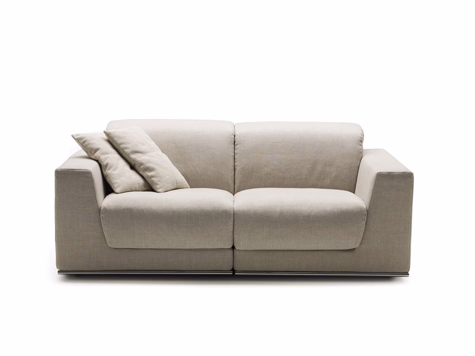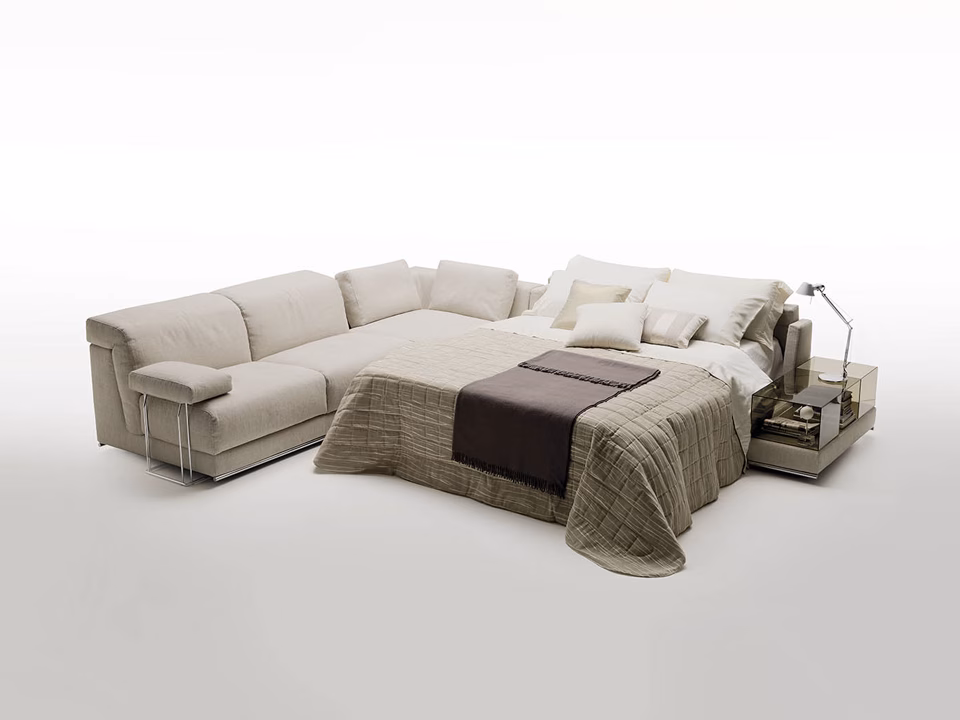 All the units in the Dennis range have been specially designed to make full advantage of comfort and space available: they offer a wide range of possible variations and can be easily put together. The seat is made of high resilient polyurethane foam with a layer of feathers on top; the backrest is made of feathers. Dennis can be transformed into a comfortable bed by simply rotating one of the units. The cover is completely removable and washable according to the fabric chosen.