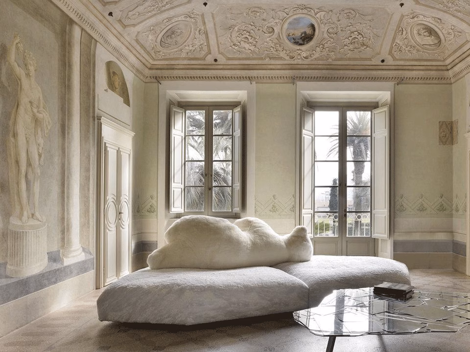 An icepack as a base. A bear lying on its side as a backrest. The seat is padded with Gellyfoam® and feather, covered with a special fabric with a texture similar to ice layers. The backrest is soft, made of polyester and covered with ecological fur. Leaning over, the big bear that supports, embraces and welcomes, for a relaxing finally freed from any constraint. The shape of the base, composed of two parts, is irregular, and corresponds to a right angle of three meters and seventy centimetres for two fifty.