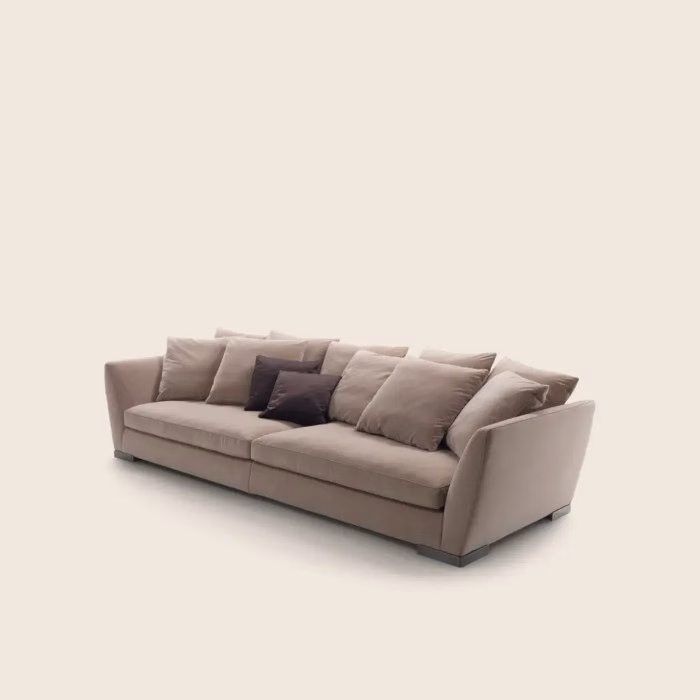 Stand-alone or sectional, the Ginevra sofa features opulent proportions and sophisticated craftsmanship details. Its contemporary brilliance lies in its great compositional versatility. Countless compositions, very different from one another, can be created by leveraging the double-depth and use of different elements. The Ginevra sofa rests on an elegant metal base that comes in an array of elegant finishes. The seat back is the same height as the armrests, which slant outward slightly, lending an overall graceful lightness. The Ginevra sofa can be enhanced with soft goose-down throw pillows made in the same fabric as the sofa upholstery for a monochromatic effect, or in contrasting fabric to underscore the sofa’s highly decorative appeal.
