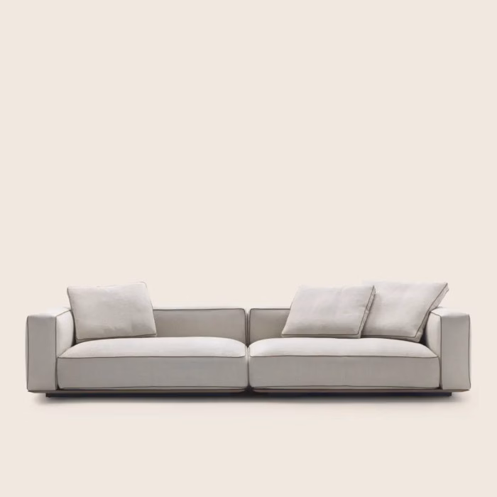 The Grandemare sofa was designed with an eye to understatement, but it is rich in (sometimes hidden) design solutions that reveal its many virtues. It is a clustering of geometric shapes – that are nonetheless soft and entirely free of sharp corners – that rest on a cowhide-upholstered wood platform. Tone-on-tone or contrasting color grosgrain piping enhances the seat, armrest and seat back upholstery. An epoxy-powder-coated metal perimeter frame, set back from the edges of the cowhide-clad platform, gives the Grandemare sofa the appearance of floating.