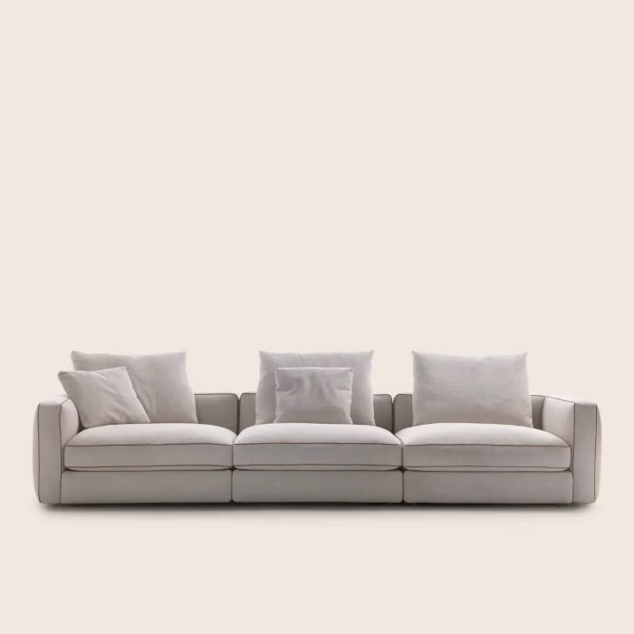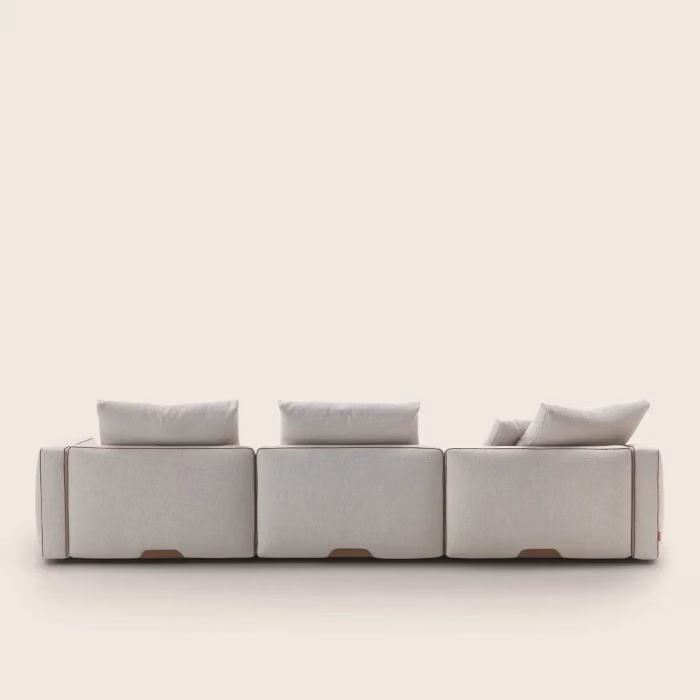 The Harper seating system has an innately elegant appeal, thanks to its balanced proportions, couture tailoring of the upholstery and exquisite handcrafted details. Saddle-hide-clad console armrests lend Harper distinctive good looks. Made of thin metal sheet clad in cowhide and available in two widths, the armrests are tailored to perform various functions. The compartment can be used to store throws, magazines, books; the handy shelf provides at-hand organization of everyday items, like remotes. Seen from the side and the back, the Harper sofa reveals refined construction details that highlight its understated elegance. The generously padded structure is finished with cowhide or metal details, available in an array of sophisticated colors and finishes. The Harper sofa comes in three depths – 99 cm, 111 cm and 126 cm – and the numerous available elements, as well as the countless combinations that can be created between fabric and leather upholstery and cowhide details, make it an extraordinarily versatile seating system that is effortlessly at home in the most diverse settings.