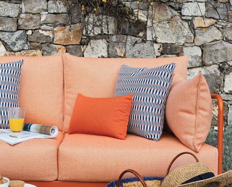 With a tubular-metal frame that has been treated and coated for outdoor use, the sturdy EASY sofas are fitted with removable covers, adding a splash of colour and providing supreme comfort. The seat cushions rest on a slatted base reinforced with polypropylene. Easy has been upholstered in polyurethane foam protected by a waterproof PVC lining and covered in water-repellent Sunbrella® fabric. The fabric gives special protection against UV sunlight and is fade-resistant, as well as having mouldproof and stainproof properties. You can enhance comfort levels by adding the Sunny scatter cushions (with removable covers) and the Rider footstools.