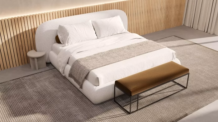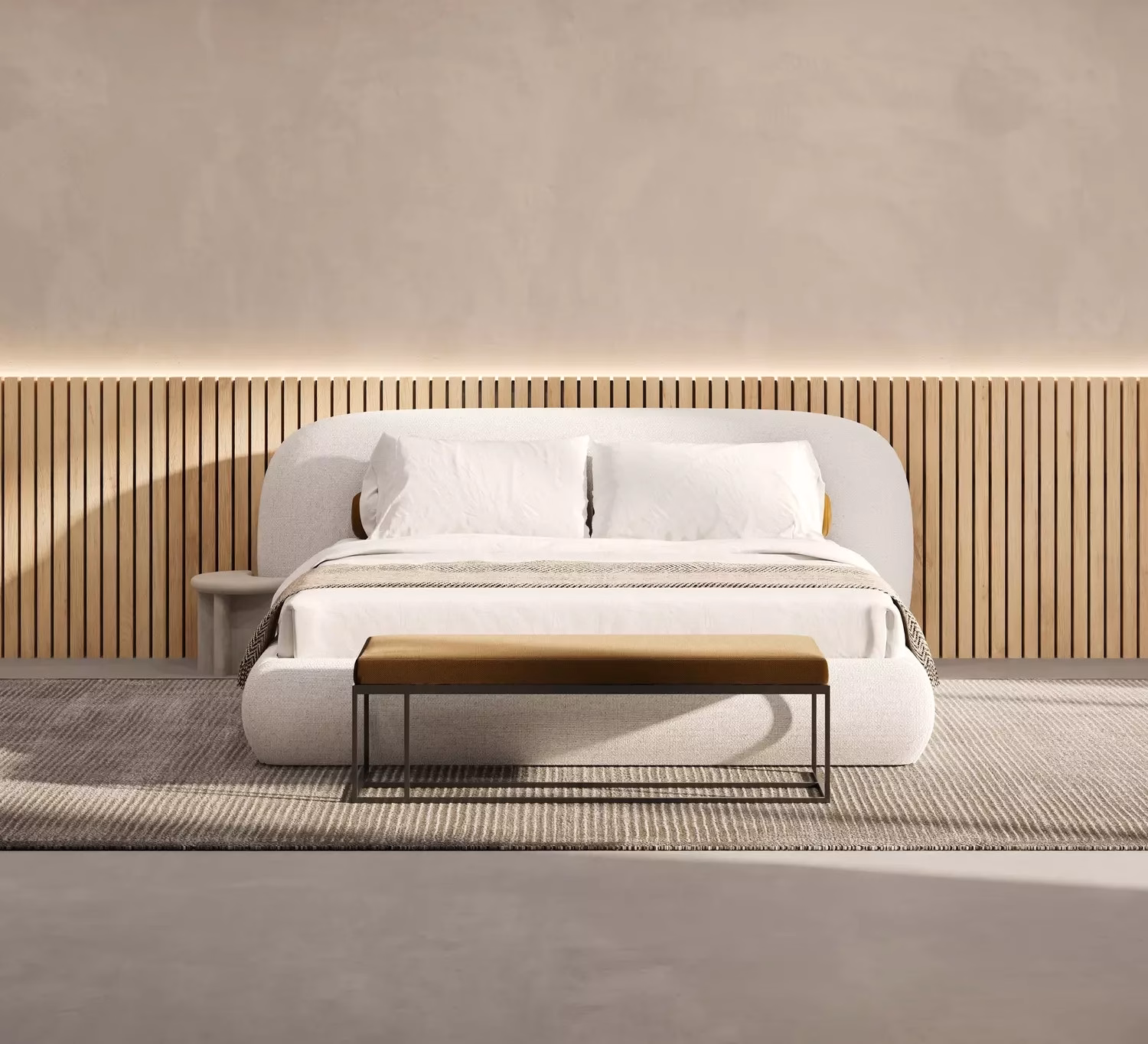 A bed inspired by how the strength of an ocean or a river can shape rocks into a soft and pleasant shape over time. The design created to feel like soft pebbles brings elegance through the refined curves, without losing sight of functionality.