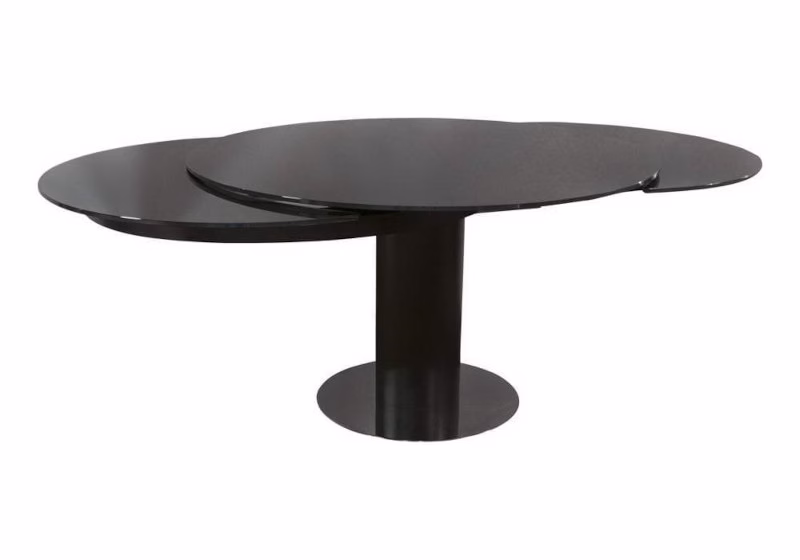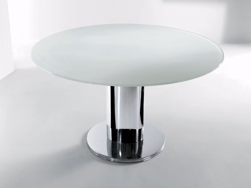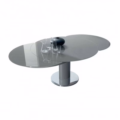 Round extending table with base in stainless metal in various colours and elliptical column in stainless steel or lacquered metal, telescopic synchronised opening mechanism. Top and extensions in glossy glass or velvet matt anti-scratch glass.