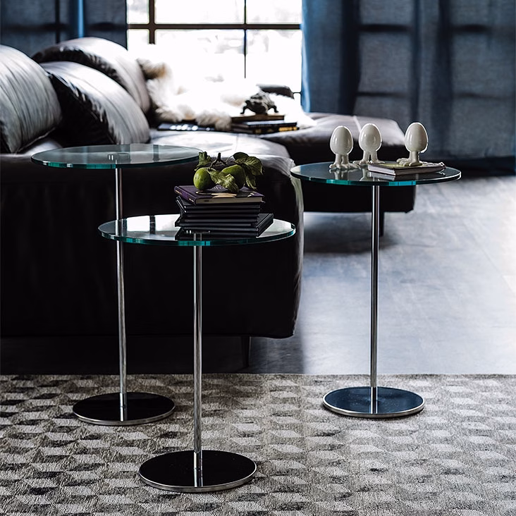 Coffee table with polished stainless steel base and chromed (08) leg. Top in polished stainless steel or in clear glass.