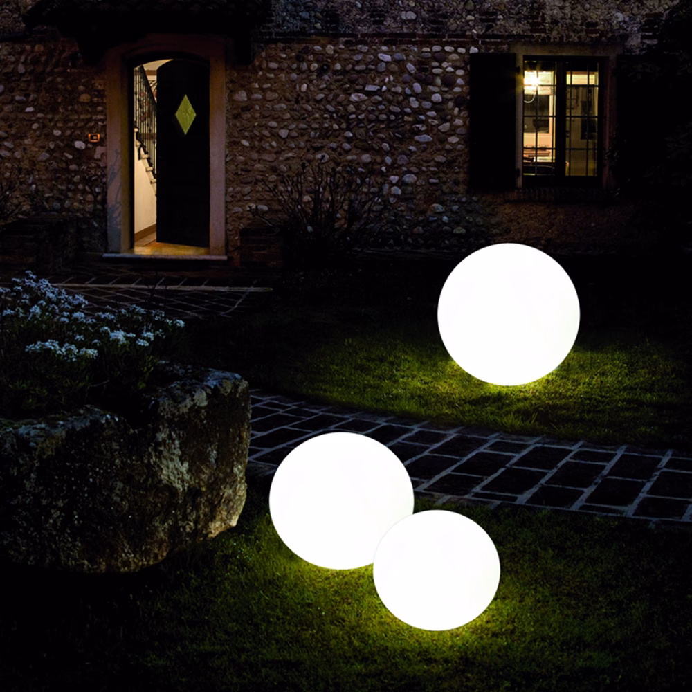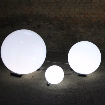 Pure and graphic luminous ball. Globo can be used indoor and outdoor, for a modern ambiance in terrace, garden, or living room. The spherical diffuser made of polyethylen gives a sensual light. You can change the atmosphere as you like and get a coloured lighting, putting a coloured bulb inside. Brand new in stock product Size: Ø 70cm