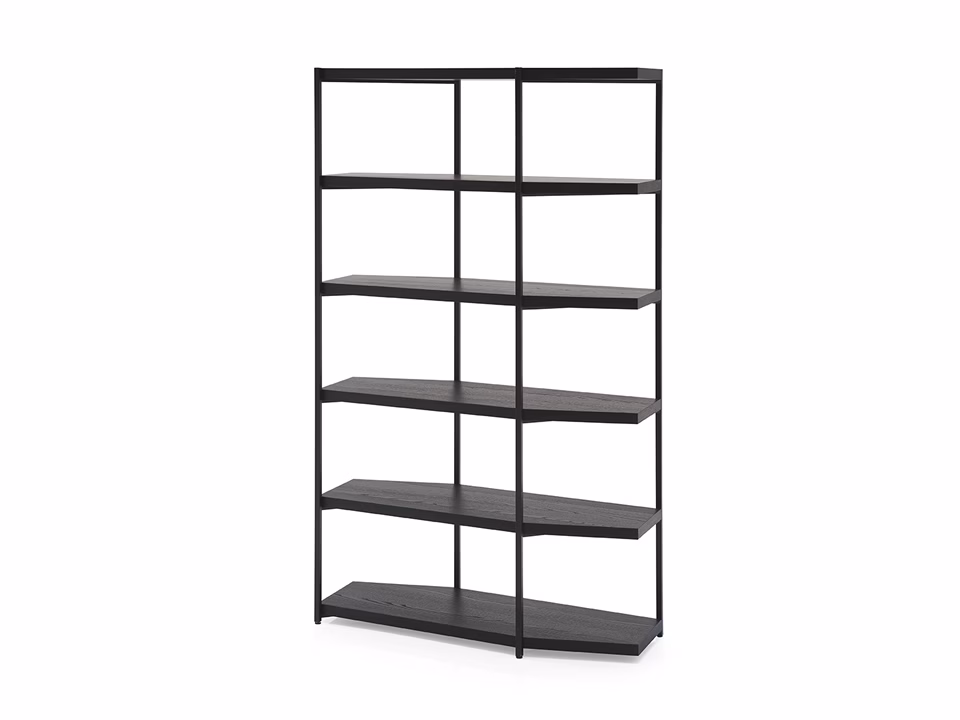 The HANGAR open bookcase system features metal uprights and shaped wooden shelves. Simple and essential lines define this functional bookcase: freestanding, modular, sectional and double-sided. HANGAR is available in two sizes, low and tall, and in a left and right version, for total modularity with shaped and irregular shelf units