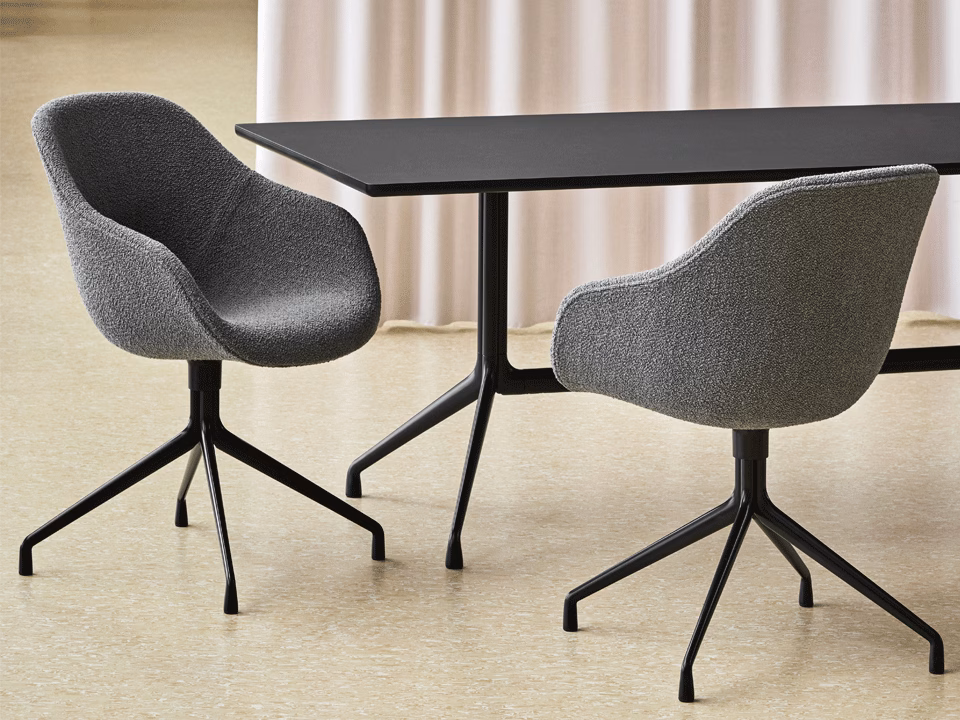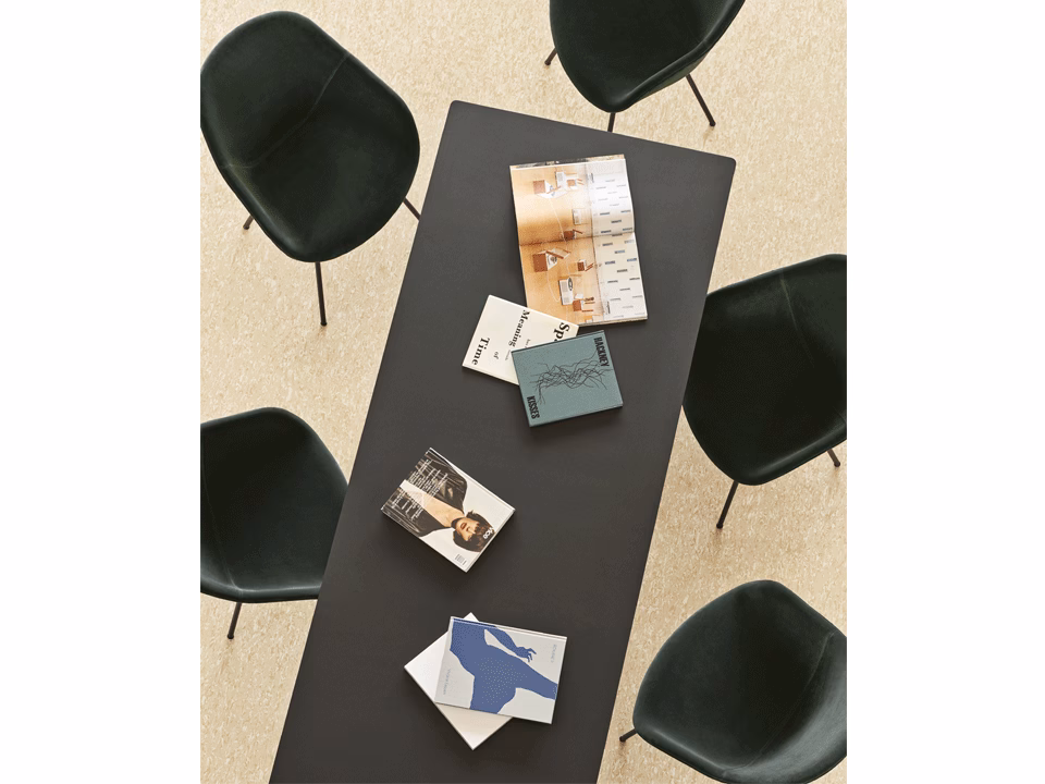 The table features the same powder coated frame as many of the chairs in the series, and the organic curves and raised feet convey a similar light expression. The tables are available with round or rectangular tabletops, with the round tabletop resting on a centred frame, while the rectangular version has its legs positioned at both ends and has a cross-bar construction.