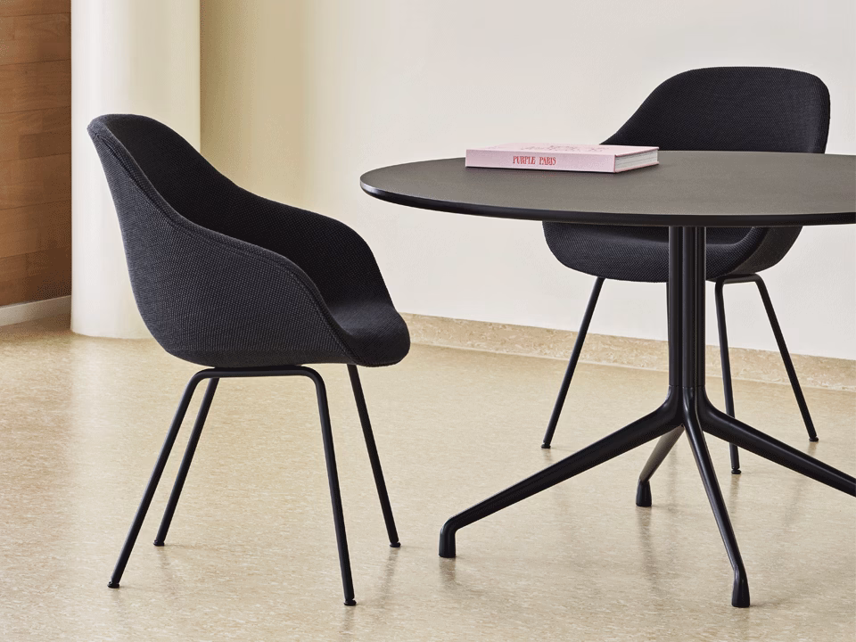 The About A Table shares the general versatility and design language as the rest of the family. The table features the same powder coated frame as many of the chairs in the series, and the organic curves and raised feet convey a similar light expression. The tables are available with round or rectangular tabletops, with the round tabletop resting on a centred frame, while the rectangular version has its legs positioned at both ends and has a cross-bar construction. About A Table is available in two heights and a wide range of dimensions, enabling you to create a unique solution to match your needs