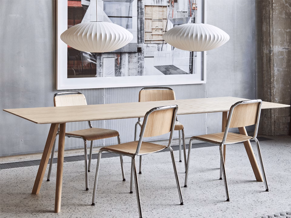 Part of the Copenhague range designed by Ronan and Erwan Bouroullec, the CPH 30 shares the same characteristic angled legs and strong identity that are consistent with the rest of the collection, yet its contrasting tabletop sets it apart. Ideal for using as a desk, conference table or dining table in an office context or a private setting. It is available in a number of sizes with an oak frame in various finishes and the tabletop comes in a variety of wood or linoleum options.
