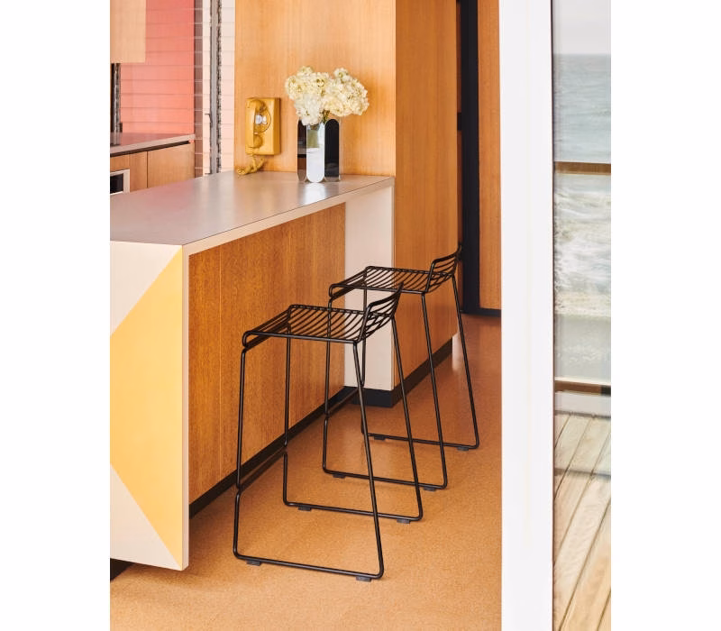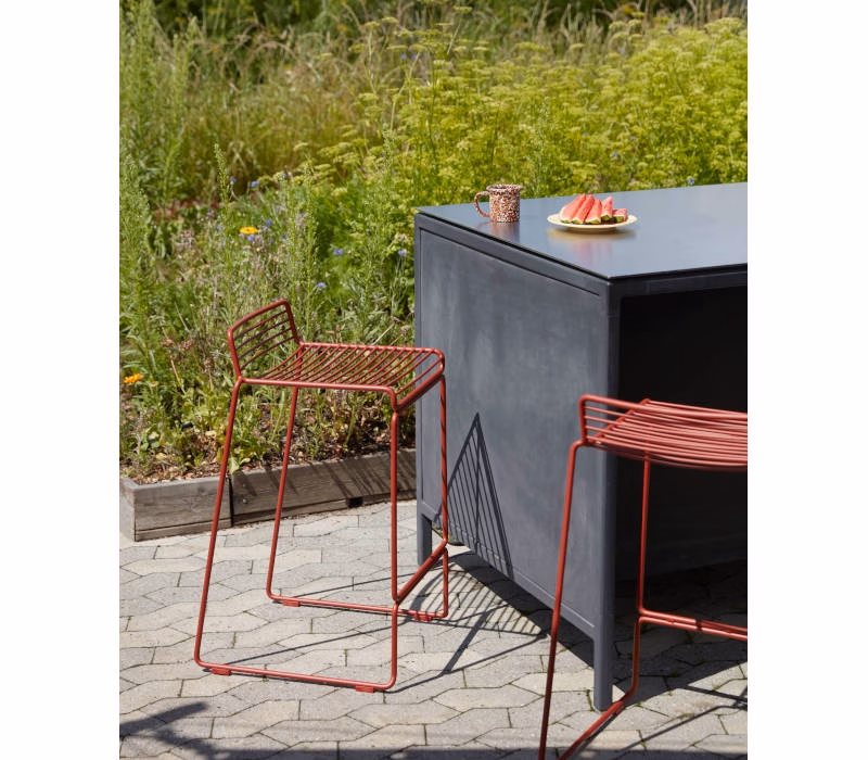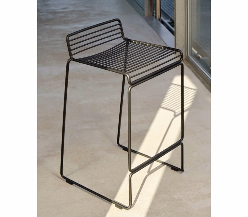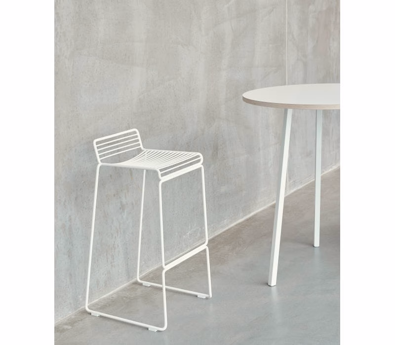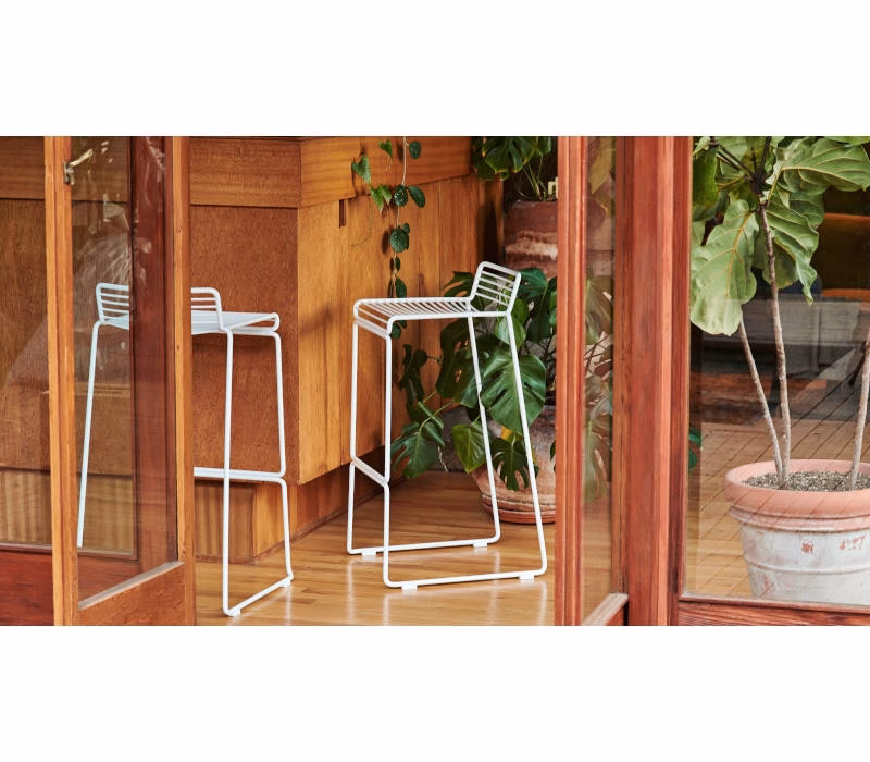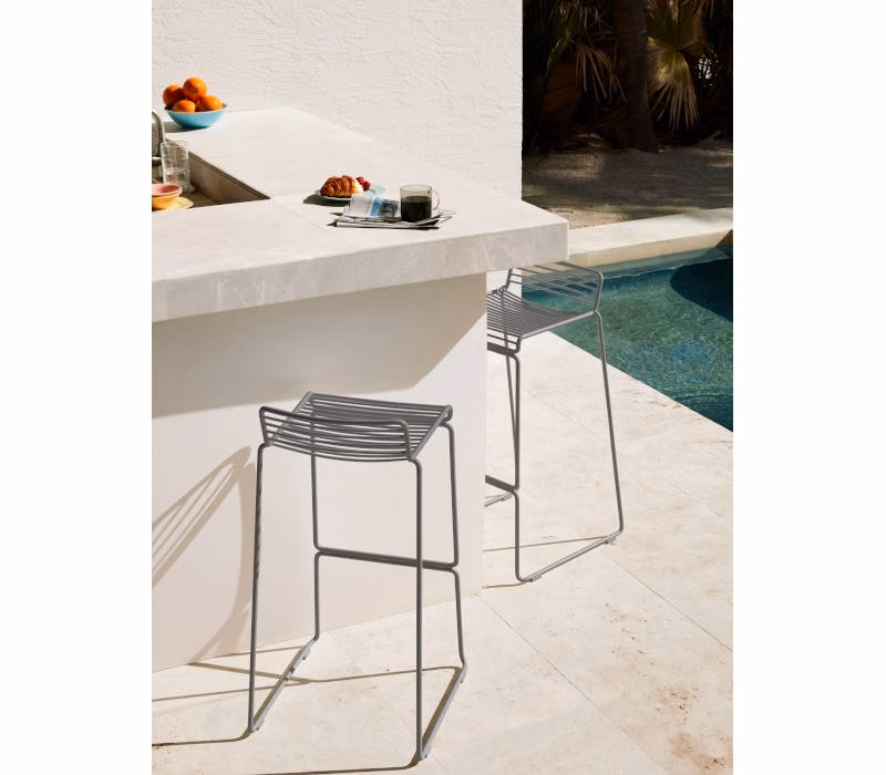 The absence of superfluous details in the Hee Bar Stool seems even more pronounced by its height and the presence of long slender legs. The ultimate in elemental design, this versatile bar/counter stool has a simple, uncluttered expression with excellent stability. Stackable and weather-proof, the Hee Bar Stool can be used in outdoor surroundings, as well as inside restaurants, bars and in the home.