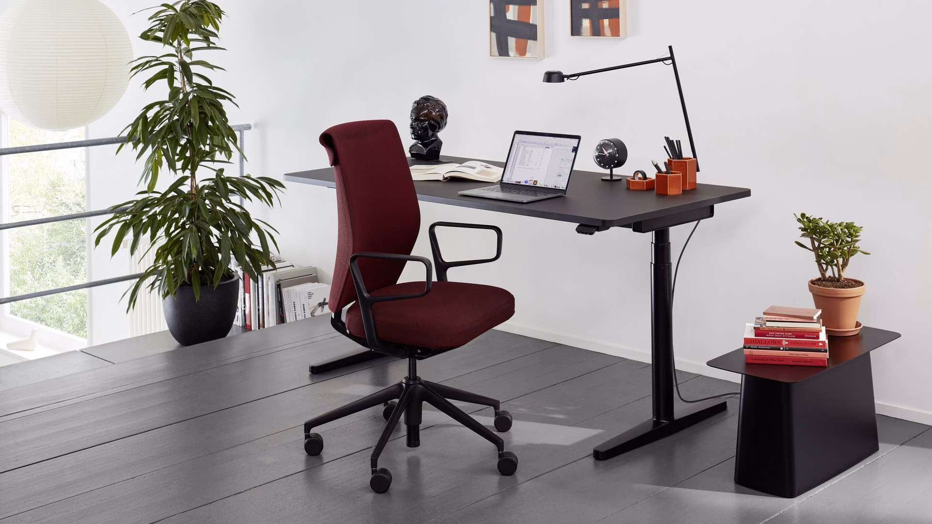 Base: five-star base in polyamide (basic dark) or die-cast aluminium, polished or powder-coated in basic dark or soft grey (to match the frame colour), with double castors (Ø 60 mm) or glides.