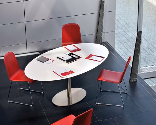 | Elliptical Inox table with brushed stainless steel base, white compact full colour top.