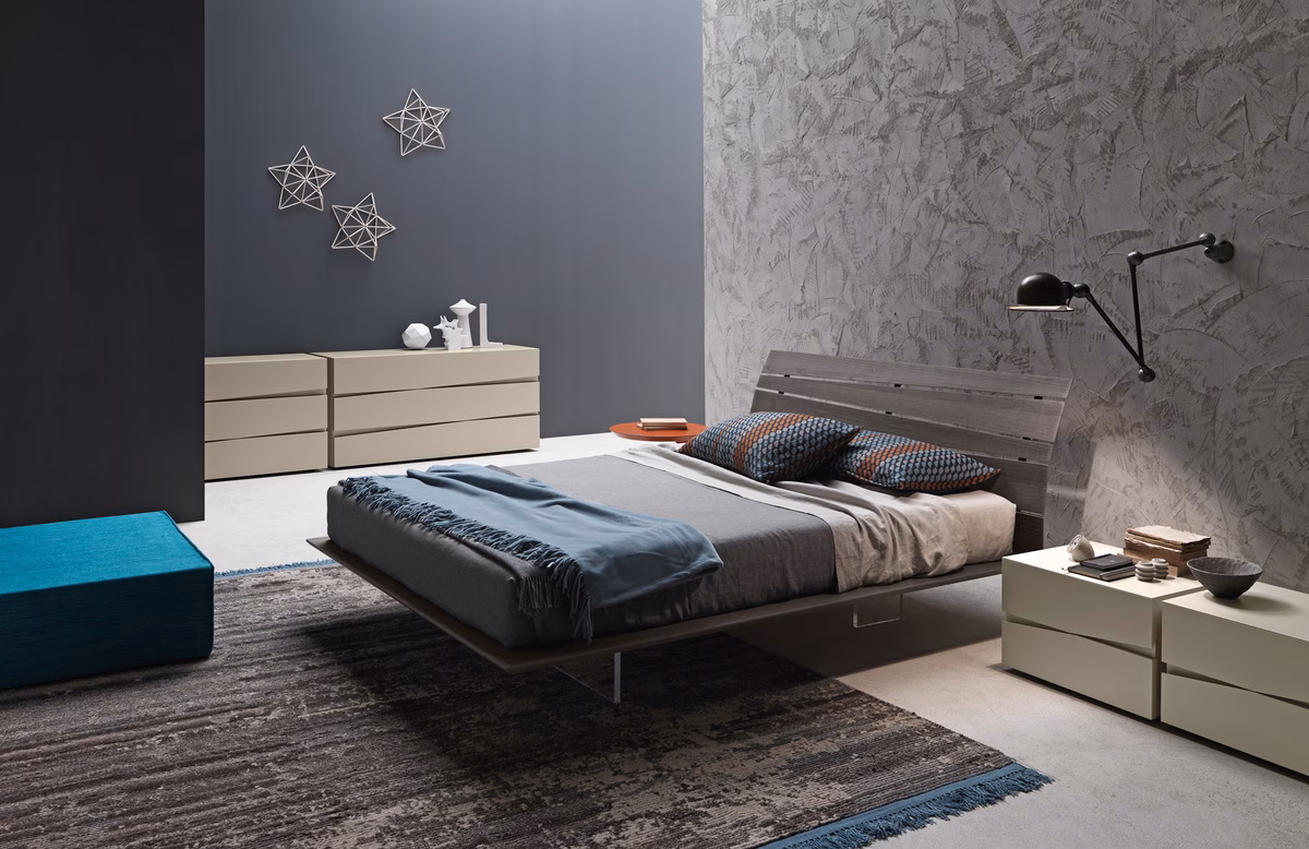 The structure and the fronts of Jazz night stands and dresser are realized in matt laquer colours. As well as having an original aesthetic impact, the peculiar oblique cut on the front panels is also used as a practical recessed handle and is available in a matching shade or in a different colour, with a lacquered or “aged” oak finish. All the drawers are soft–close. The model is supplied with recessed handles.