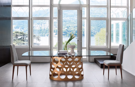 The Jean dining-table has a metal base with a bevelled edge glass top (thickness mm. 15)