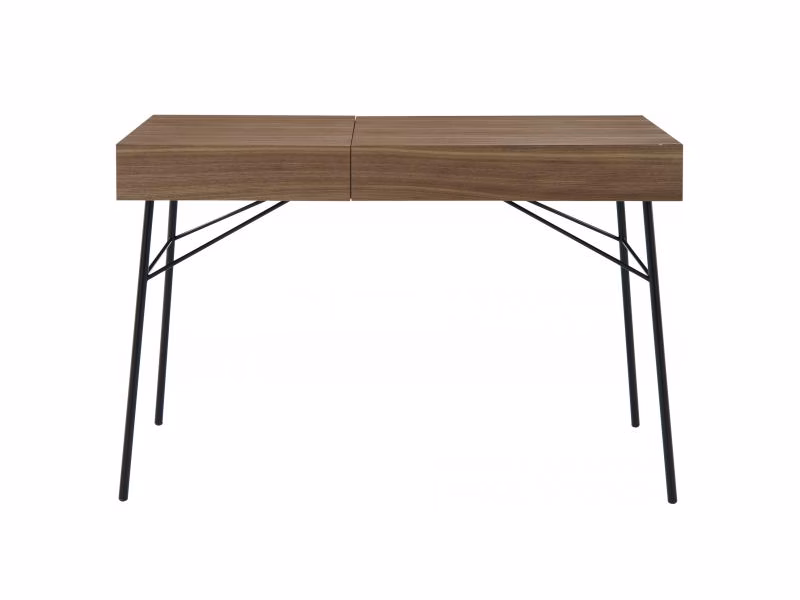 The dressing table space offers a large work surface. This is complemented by a drawer and a second storage space closed by a lift-up cover. This cover has a large mirror on its internal face, which can be used when the cover is in open position. The whole piece is made from panels of MDF finished in blond American walnut veneer, which brings a touch of both richness and warmth.