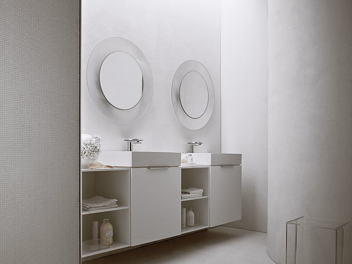 A well-defined graphic touch that evokes a heritage connotation and takes its inspiration from one of the most ironic pieces in the Kartell collection: the Bourgie lamp and its unmistakable Baroque style. The chance to switch from transparencies to the chrome-plated gold and silver models on offer makes this mirror an extremely versatile and adaptable design piece able to create contemporary and essential settings or eccentric and outside the box environments.