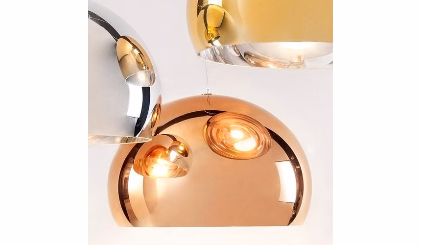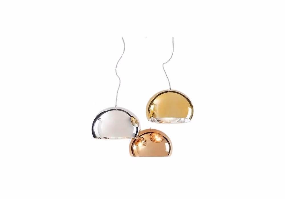 This Kartell FLY metal pendant suspension light has a metallic PMMA acrylic diffuser shade made in a solid & stunning, gold, silver or copper exterior