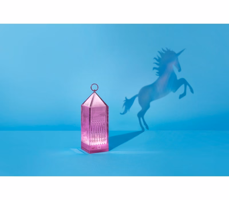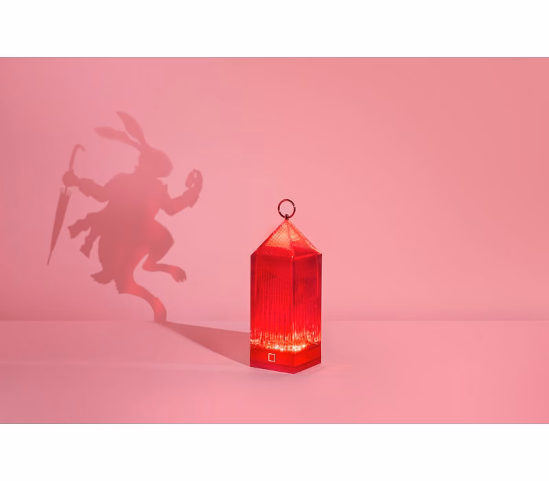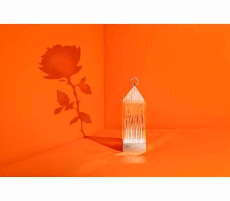 Lantern is an original portable LED, transparent, “chargeable”, injection moulded lamp that charges by placing it onto a charging base. The light is projected by a graphic effect of the design.
