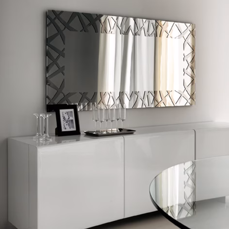 Wall mirror in mirrored or smoked grey mirrored glass. Polished stainless steel applied frame. Mirror is equipped with plates for horizontal or vertical installation.