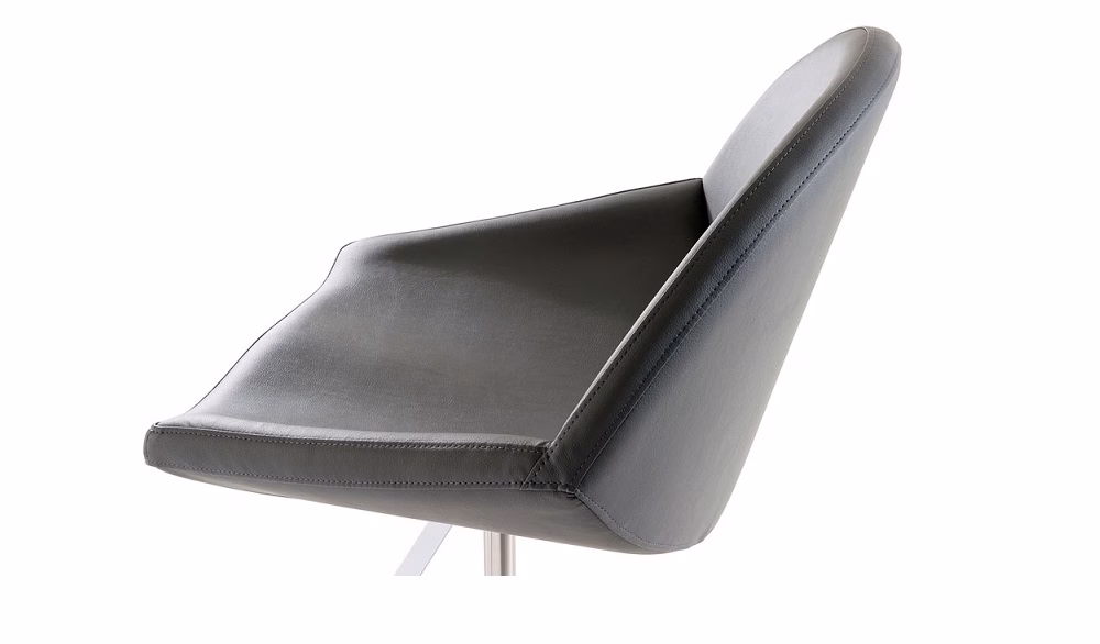 Swiveling stool, adjustable in height, with satin stainless steel base plate and column, footrest and gas piston in chromed steel (08) or with base plate, column, and footrest in black (GFM73) embossed lacquered steel and gas piston in chromed steel (08). Upholstered seat covered in fabric, synthetic nubuck, micro nubuck, soft leather or synthetic leather as per sample card. The soft leather, synthetic nubuck, micro nubuck and synthetic leather covers are not removable.