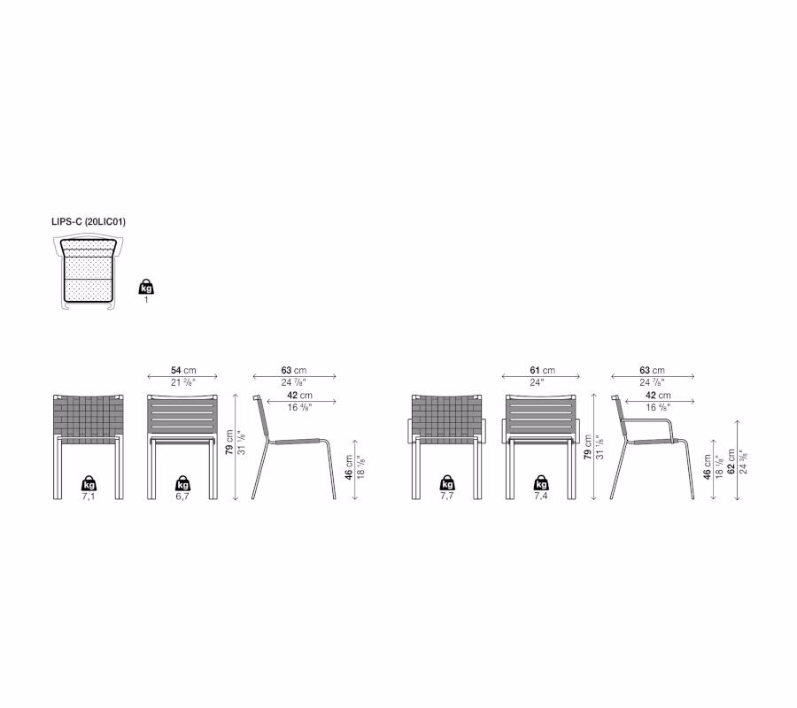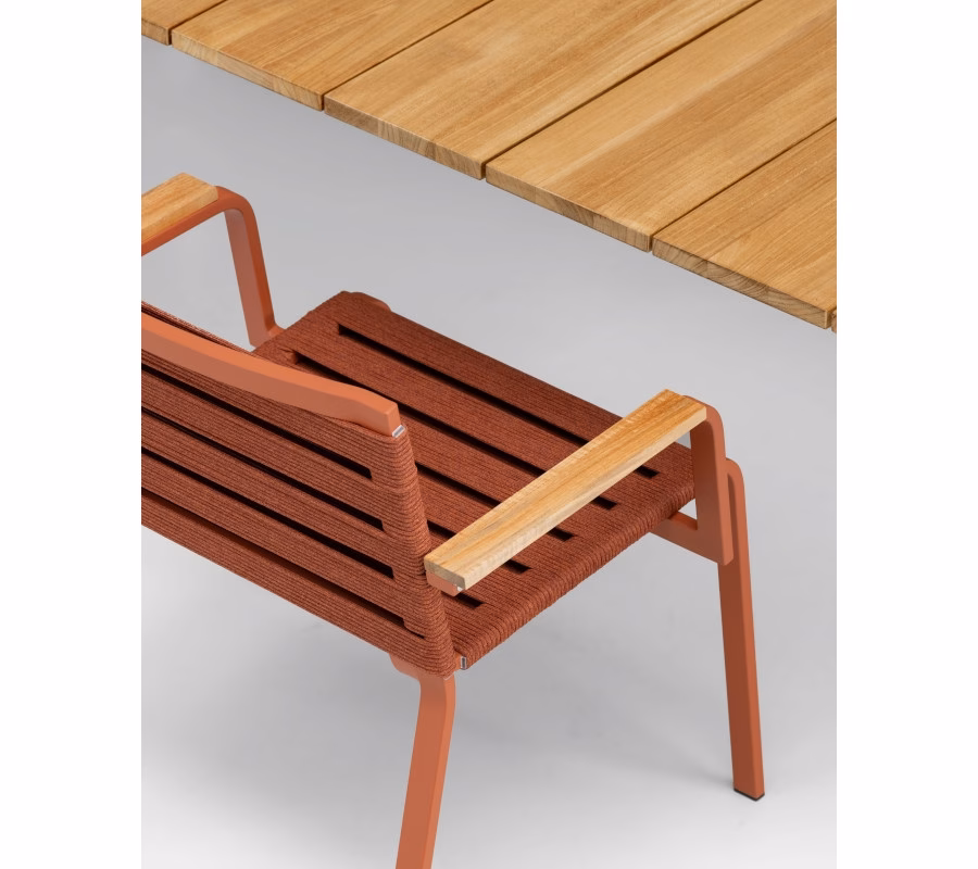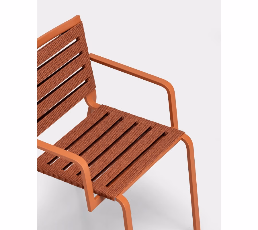 An entire collection developed together with two outdoor design specialists: Harry&Camila. It includes a stackable chair and lounge chair with or without armrests, a stackable chaise lounge and a lounger on wheels. They have powder-coated aluminium frames suitable for outdoor use, whereas upholstery is made of polyester rope or interlaced straps. The items in the Rest collection can be made even more comfortable and attractive by adding Lips removable padding, available in a variety of colour combinations