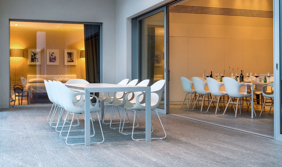 The top is made of thin Fenix-NTM® slats: a material with warm and soft aesthetic, which is light, sturdy and resistant to weathering. The frame is made of anodized aluminium, an eco-friendly material ideal for outdoor use. In addition to a wide range of tables in different sizes, the collection includes a matching bench for use as a chair or a versatile furnishing accessory, which can be complemented with a Lips removable cushion.