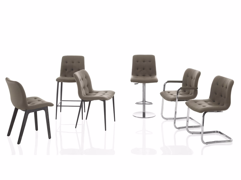 - Material: Chair and stool with solid wood or metal frame. Shell upholstered and quilted.
