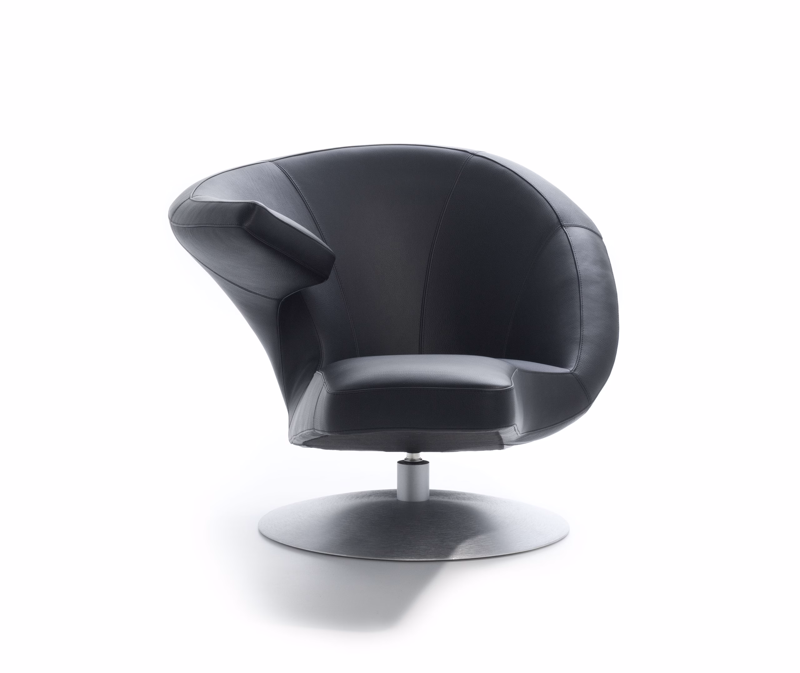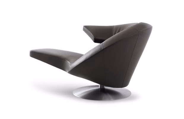 Its powerful design makes the Parabolica swivel armchair a fantastic object in your living room. The asymmetric form allows at least three user experiences: sitting “normally”, laid back relaxed or sitting actively with the armrest as a little desk. A real eye-catcher, with great versatility.
