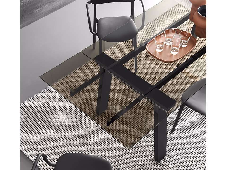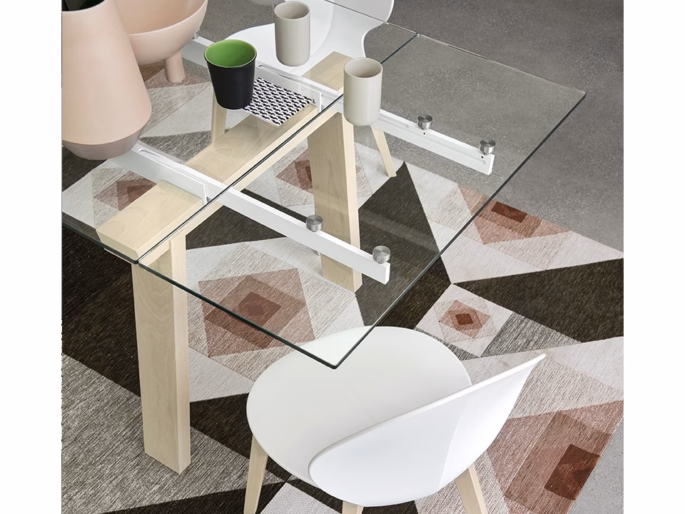 LEVANTE table in mixed materials: wooden base, metal guides and glass top.