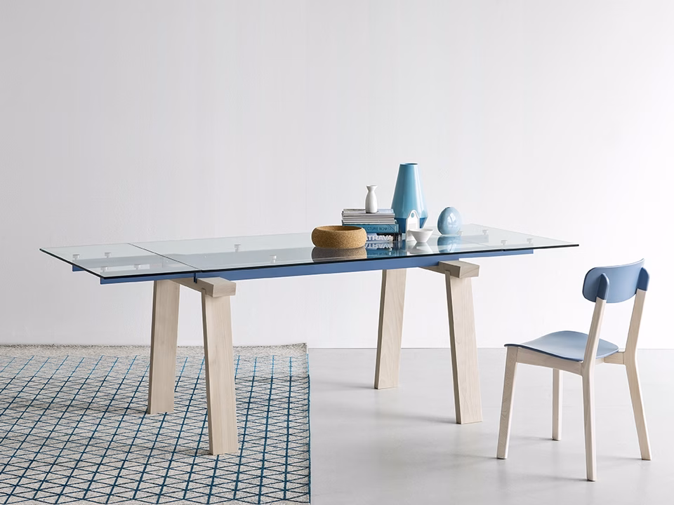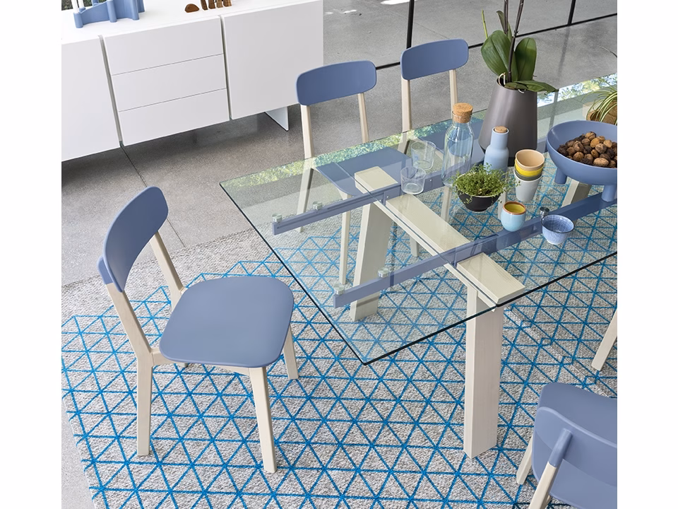 A table combining the tactile nature of wood with the transparency of the glass top which reveals a touch of colour, given by the two aluminium guides. The table is fitted with two side extension leaves to seat several guests. Many combinations are possible thanks to the different colour finishes of the three elements. An amazing timeless mix that can be easily matched to several chairs in the Calligaris collection.