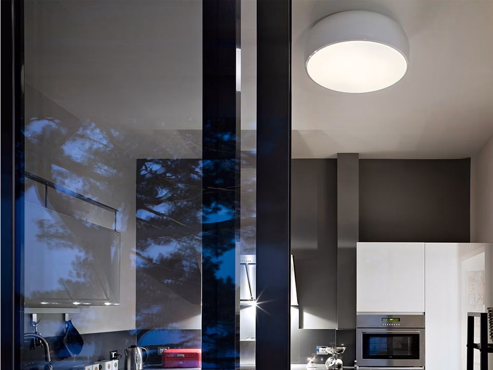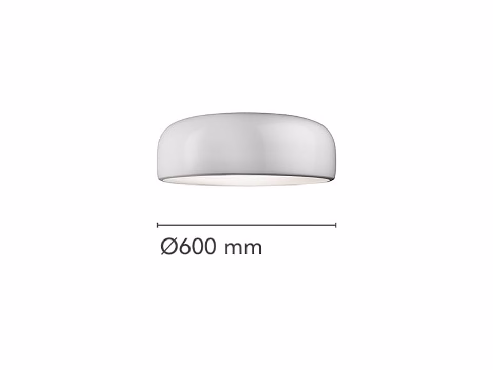 Ceiling-mounted lamp providing direct light. Aluminium body. Available in gloss black, white or MUD. Injection-moulded opalescent methacrylate diffuser. Steel wall and ceiling attachment.
