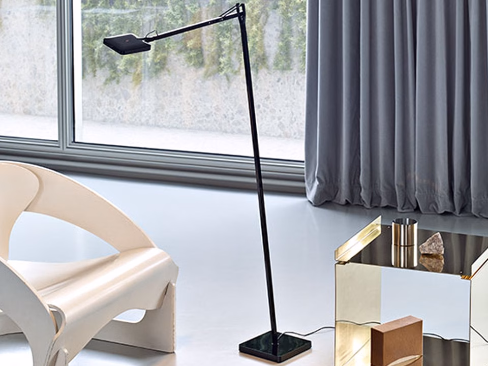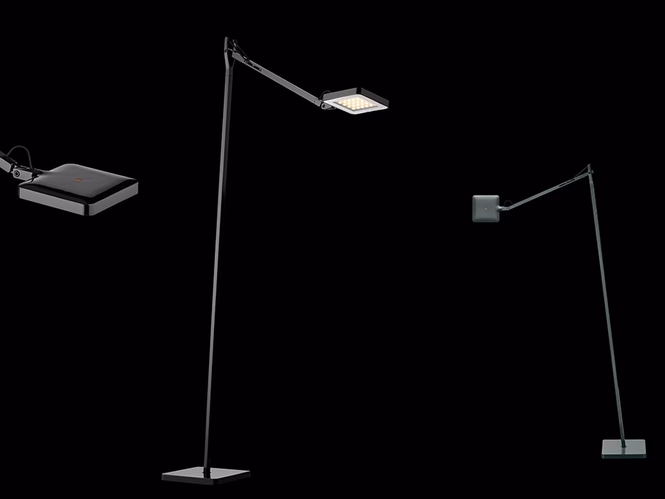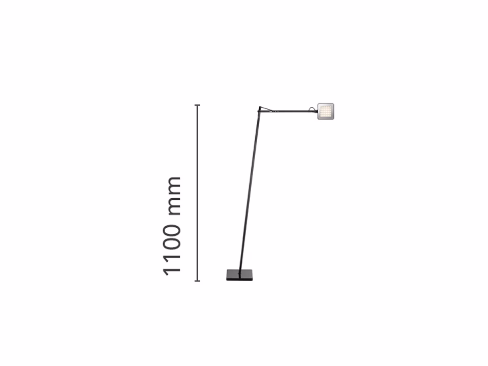 Floor lamp. Head in pressofused aluminium, diffuser in PC. Power pack on plug, base cover in injection printed PC, counterweight in iron cut and painted by means of a cataphoresic process. Directionable head. Three-step ON/OFF switch with Soft Touch technology. Base separated from the lamp body with safety locking pin.