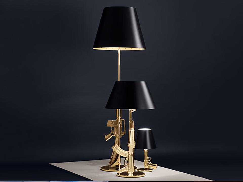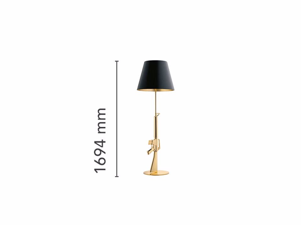 Floor lamp providing direct reading and ambient lighting. Body is die cast aluminum with an overmolded polymer coating and gloss 18K gold plated. Matte black plasticized paper shade with an internal gold silkscreened or white with an internal silver silkscreened. On the cable there is the electronic dimmer which allows the regulation of light brightness.