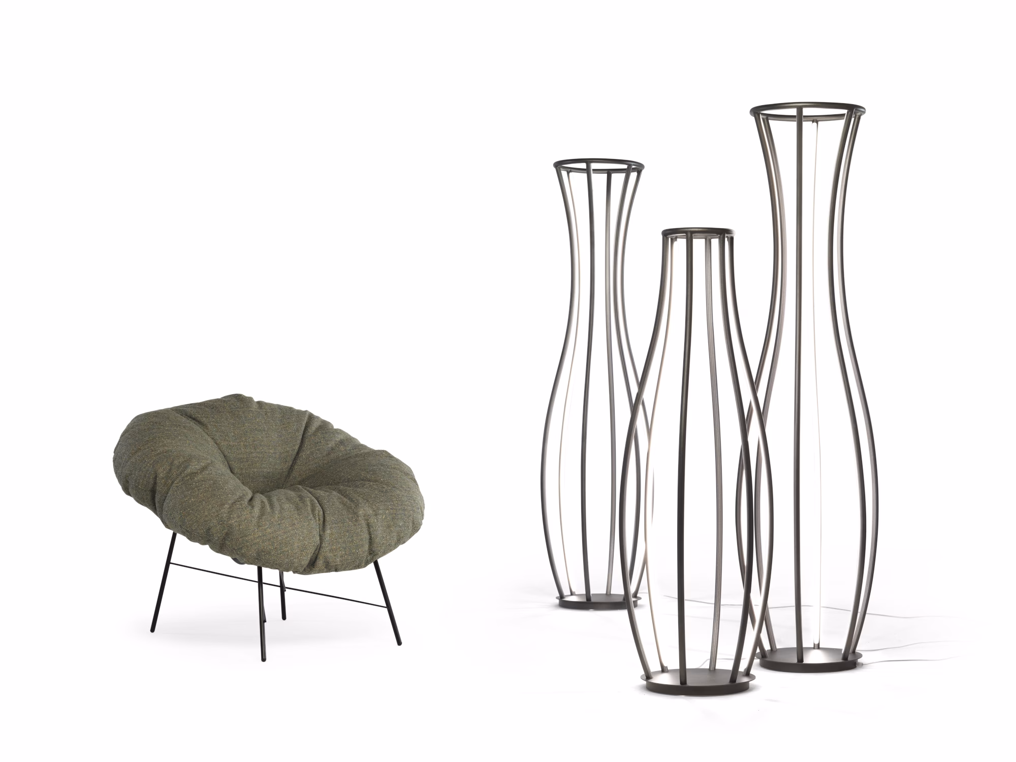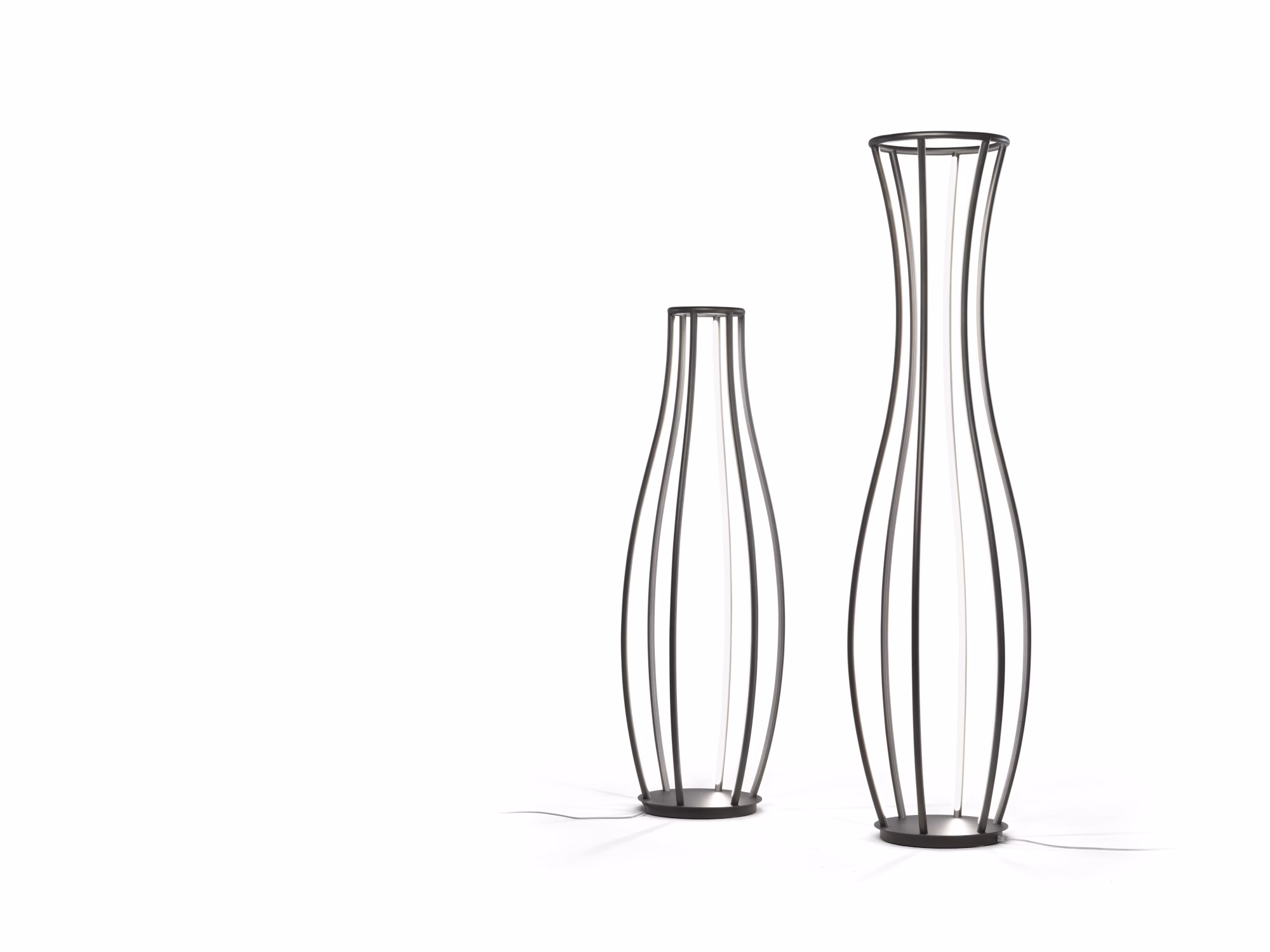 Penelope is a floor lamp in curved metal painted in micaceous black with LED light. Available in two heights. Penelope was born from the synthesis of a sign, sinuous and harmonious like the perfect profile of a woman. A profile that houses a light source inside, skillfully combining form and function.