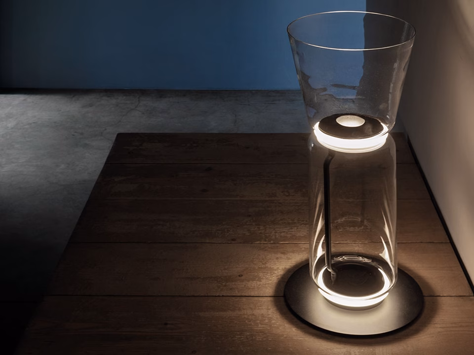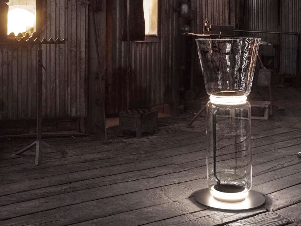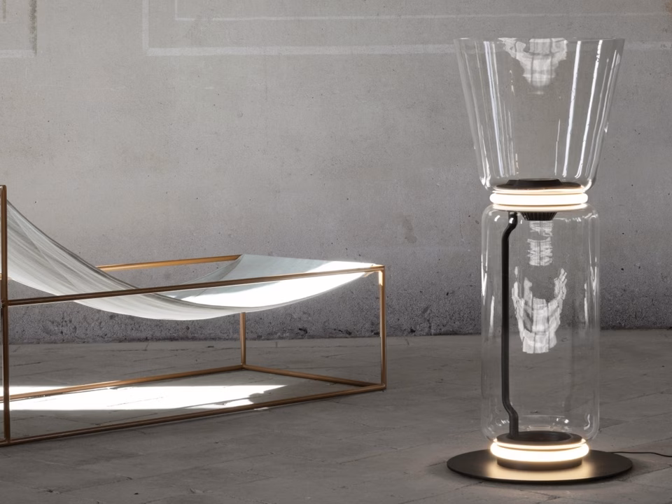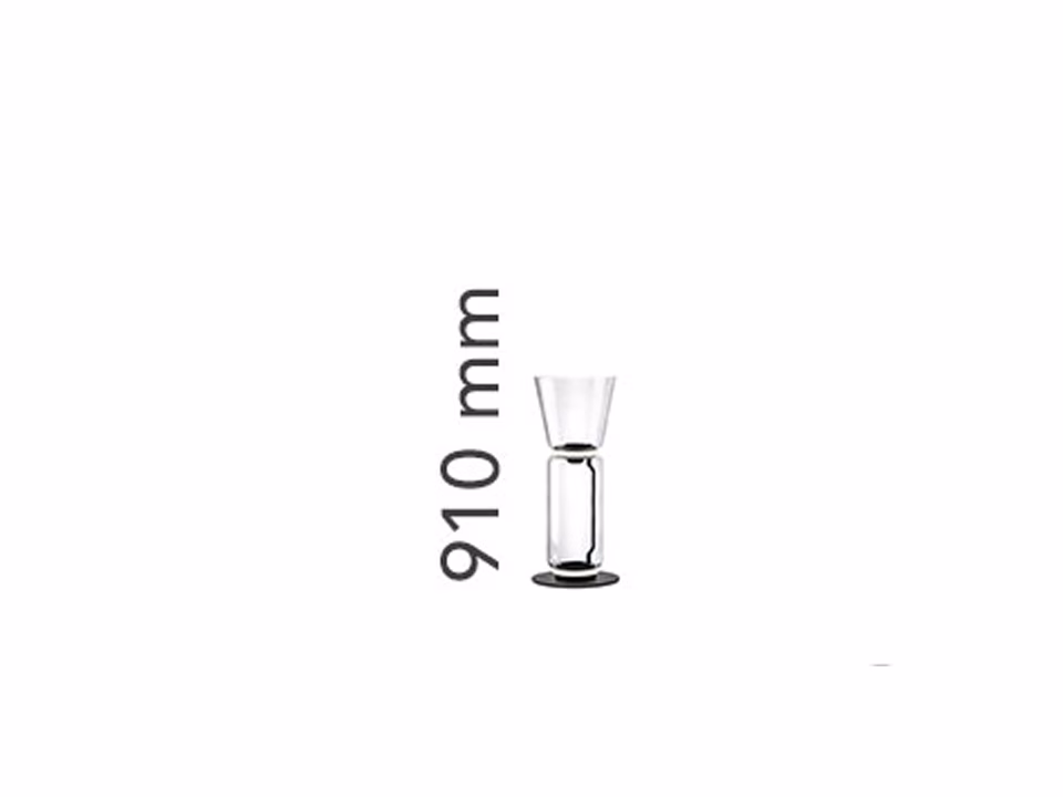Standing lamps consisting of interconnecting glass modules reaching a height of 2,17 metres (85.43″). Cylindrical and semi-spherical transparent blown glass structure, die cast aluminium base and rings, hydroformed steel internal lateral arms and injection moulded optical opal silicone outer ring diffusers.