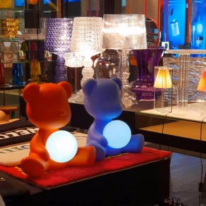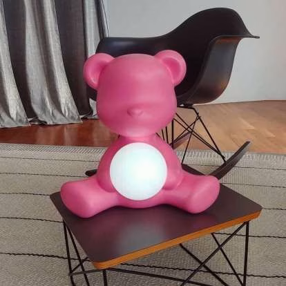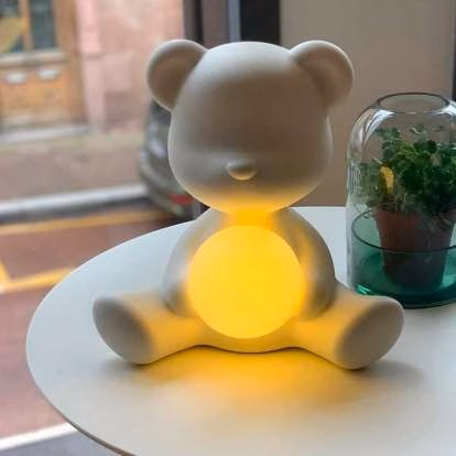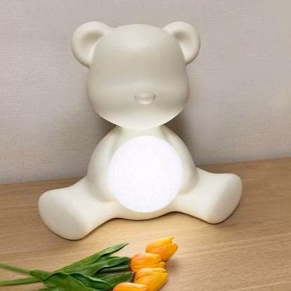 Designed by Stefano Giovannoni in the looking of a traditional Teddy Bear, Teddy Girl is a wireless rechargeable table lamp, embracing a small luminous sphere. Timid and delicate, it brings to light the little teddy bear’s tender soul.