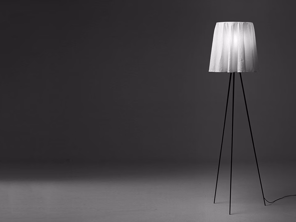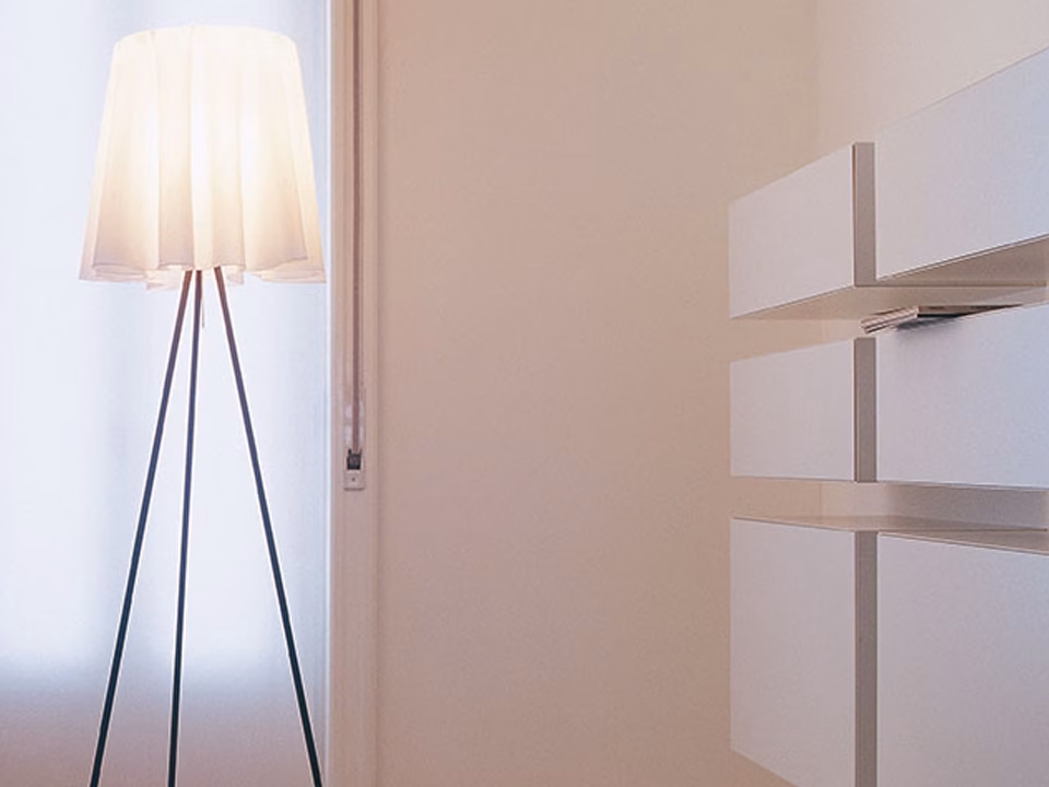 Floor lamp providing diffused light. Special ultra-lightweight fabric shade. Aluminum stems. Foam polycarbonate lamp-holder.