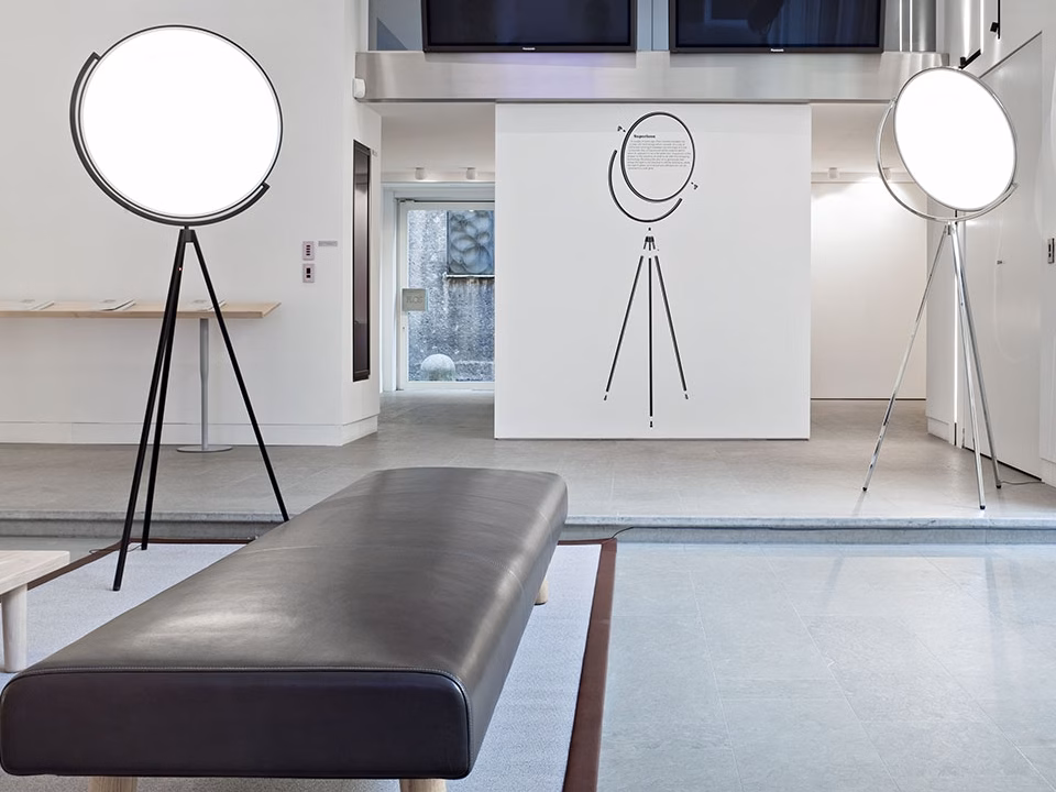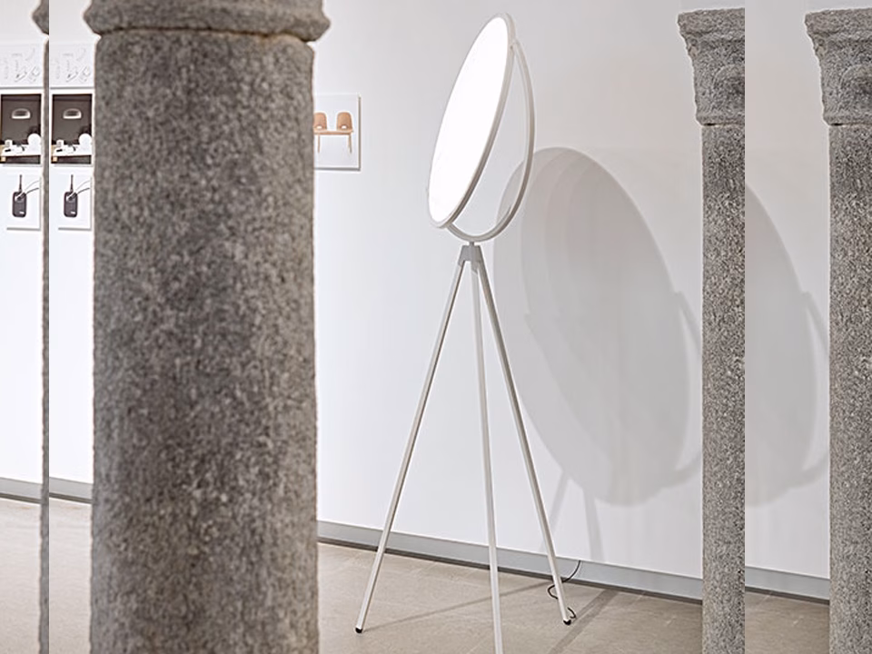 Adjustable floor lamp providing direct light. Painted or chrome-plated aluminium body with metal spinning head, die-cast joints and extruded stem. Silk screened PMMA diffuser. Edge Lighting technology light source.
