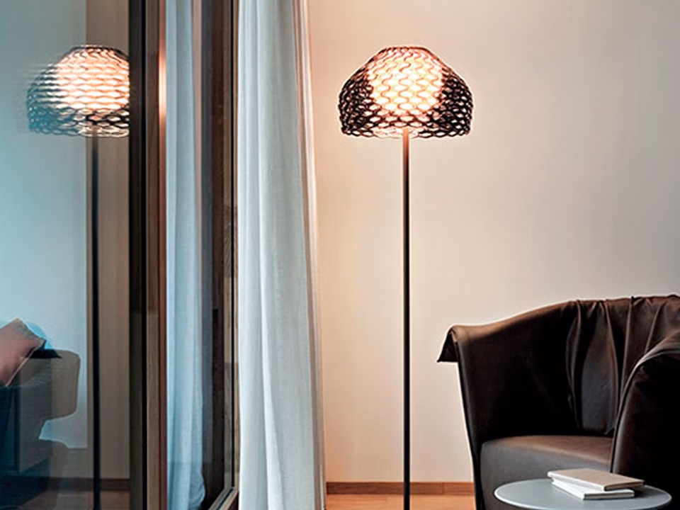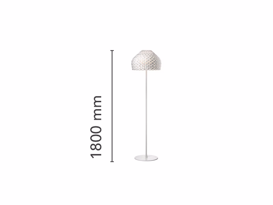 Diffused light floor lamp. External diffuser in Polycarbonate. Internal diffuser in injection-printed opal Polycarbonate. Support and base in painted steel.