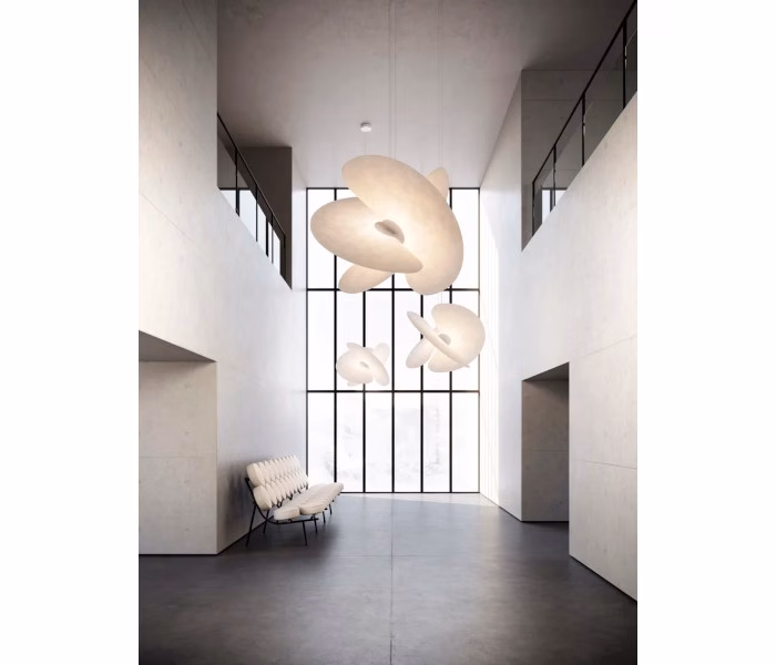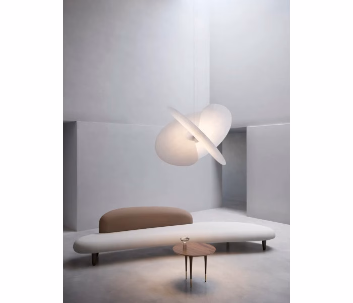 Levante is a strong-impact chandelier. It consists of an intersection of three large fans, in an unusual material for the design sector – it comes instead from the food industry, looking like rice paper and able to evenly diffuse its light around the whole area. The fans are very fine and magnetically attached to the central section which holds the bulb, hidden away like a real and beating heart