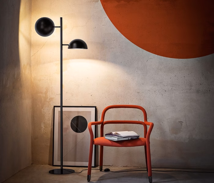 Charlotte floor lamp. The lamp is made with a metal base and structure to which two adjustable lampshades are anchored. The lamp is available in different colors. On the electric power cable there is the on / off foot switch. The cable has a length of 2 m and is covered in black silk.