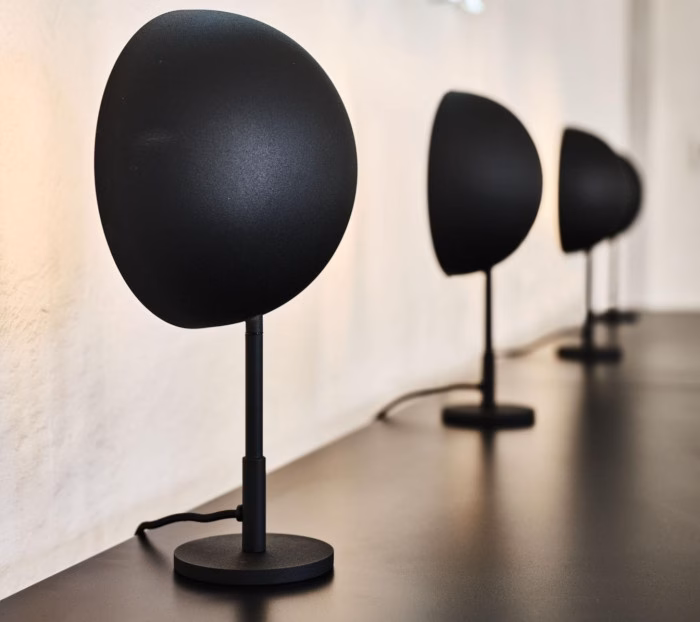 Charlotte table lamp with direct light. The structure and the lampshade is made in metal and the lampshade can be moved as desired. On the power cable there is the on / off switch. The cable has a length of 1.5 m and is covered with black silk.