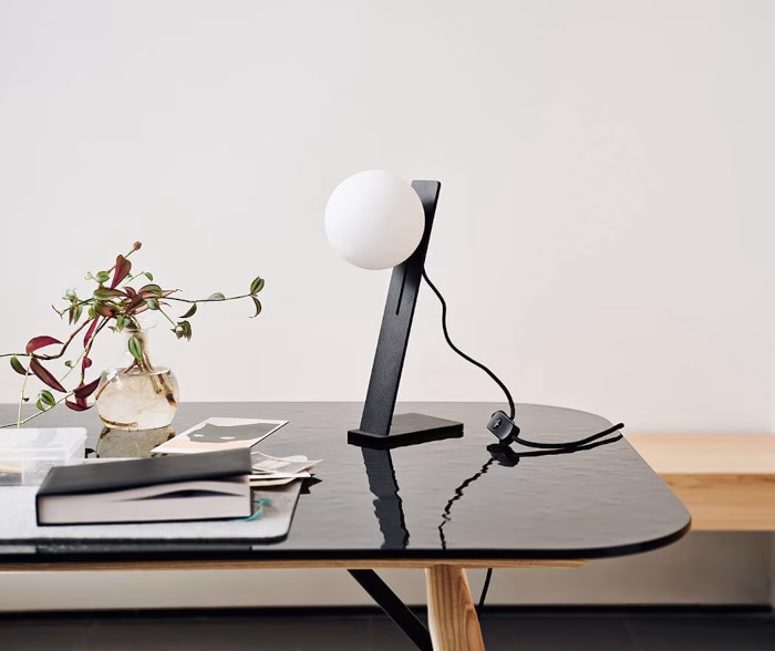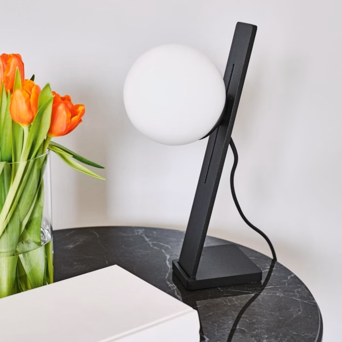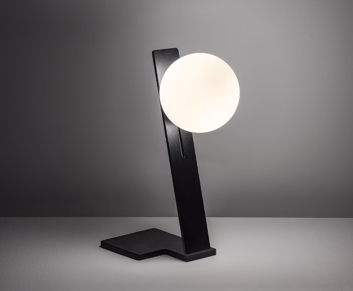 Suspense table lamp with direct diffused light. The diffuser is made of satin glass and is adjustable in height along the support bar. The support is made of metal in the single variant in black. The white and opal light runs along the band in an exercise of timeless forms. On the electric power cable there is the on / off switch. The cable has a length of 1.5 m and is covered with black silk.